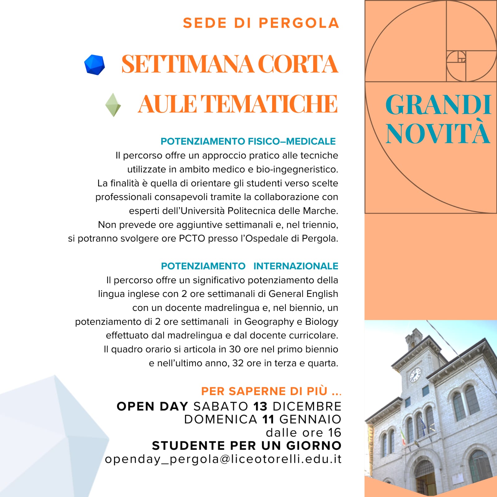 Venite a scoprire come il nostro liceo possa offrire solide basi per affrontare con successo il mondo universitario e professionale! Vi aspettiamo numerosi per rispondere a tutte le vostre domande e mostrarvi la passione e l’impegno che mettiamo nel nostro progetto educativo.